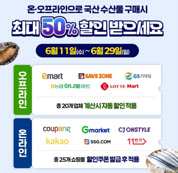 6월 11일부터 6월 29일까지 무려 19일간, 국산 수산물을 최대 50% 할인된 가격으로 만날 수 있는 대규모 행사랍니다.